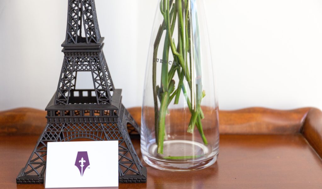 The night before (typical writer… leave it to the last minute) our scheduled brand photography session, I picked up a few extra props reflective of the Waypoint Writing brand that I hoped would prove useful to our Branding Photographer and PR Strategist, Kristin Hardwick. A few of them included a wrought-iron fleur-de-lis symbol, as featured in the center of the Waypoint Writing logo, as well as a replica of the Eiffel Tower — the backdrop image on the website and some of our social media, along with bunches of freesia and irises, representative of various shades of our brand color, ultraviolet.